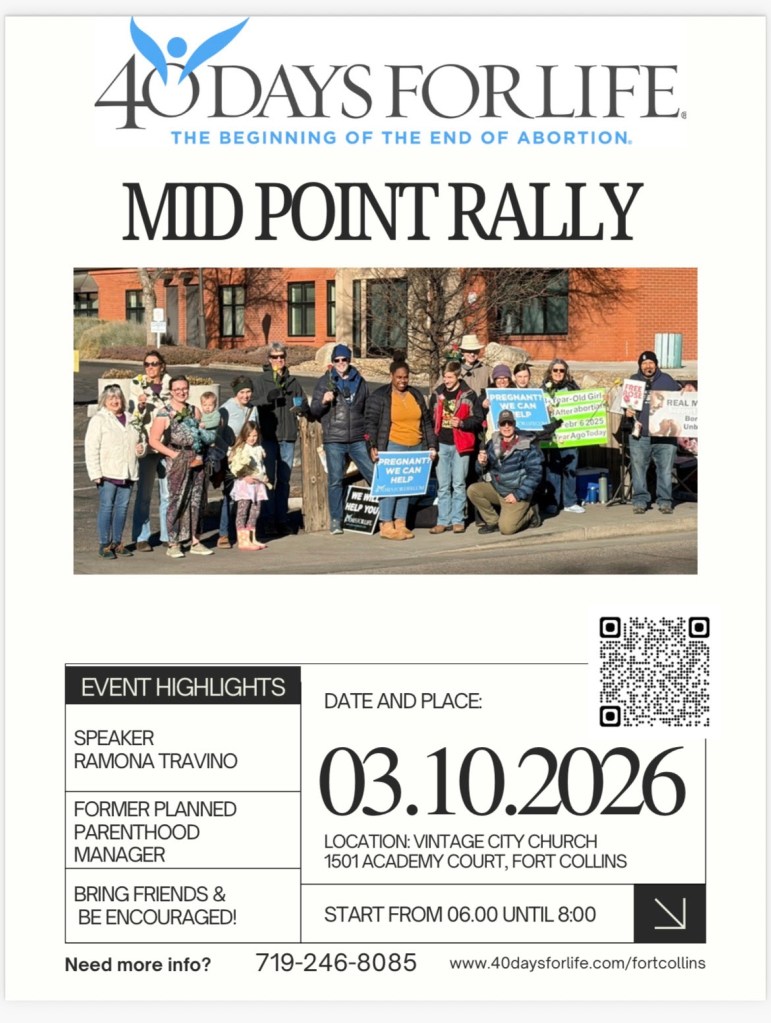 - Sign up at www.40daysforlife.com/fortcollins to come pray Wednesday – Saturday on abortion days!